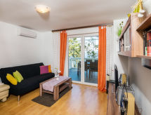 "Helena (MOD155)", 2-rums-lägenhet 30 m2, på bottenvåningen. Vardags-/matrum med 1 bäddsoffa och sat-TV (flatscreen TV), luftkonditionering. Utgång till terrassen. 1 rum med 1 fransk säng. Öppet kök (2 kokplattor, brödrost, vattenkokare, mikrovågsugn, elektrisk kaffemaskin). Dusch/toalett. Terrass 12 m2. Terrassmöbler. Utsikt på havet. Till förfogande: Internet (Trådlös LAN [WLAN] , gratis). Notera: rökfri lägenhet. Privat entré, privat entré. Max antal personer: 2 vuxna, 1 barn upp till 12 år. .- Utrustning