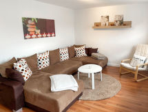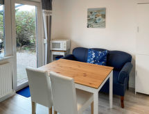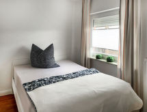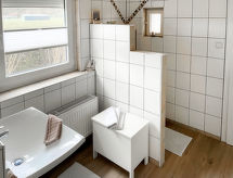 3-rums-hus 85 m2 med 2 våningar, på bottenvåningen. Vackert och smakfullt inrett: vardagsrum 17 m2 med sat-TV (flatscreen TV), stereoanläggning och DVD. Kök 11 m2 (ugn, diskmaskin, 4 kokplattor - glaskeramikhäll, mikrovågsugn, elektrisk kaffemaskin) med matbord och radio. Utgång till terrassen. Dusch/toalett. Övre våning: (brant trappa) 1 rum 13 m2, med snedtak med 1 dubbelsäng (200 cm, längd 200 cm), sat-TV (flatscreen TV). 1 rum 11 m2, med snedtak med 2 sängar (90 cm, längd 200 cm). Terrassmöbler. Till förfogande: tvättmaskin, hårtork. Internet (Trådlös LAN [WLAN] , gratis). Notera: rökfritt hus. Max 1 husdjur/hund tillåtet. Brandvarnare.- Utrustning
