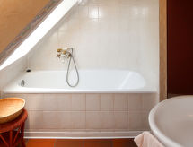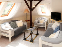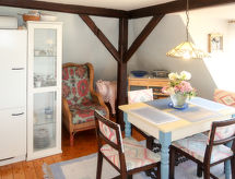 2-rums-lägenhet 60 m2, på övervåningen. Ljus, sluttande tak, mysigt inredd: vardags-/sovrum med 1 säng (100 cm, längd 200 cm), sat-TV (flatscreen TV). Vardags-/sovrum med 1 fransk säng (140 cm, längd 200 cm), sat-TV (flatscreen TV). Kök (ugn, 4 kokplattor - glaskeramikhäll, brödrost, vattenkokare, elektrisk kaffemaskin) med radio. Sittbadkar/toalett. Trägolv. Utegrill (flyttbar), vilstolar (2). Vacker utsikt på landskapet. Till förfogande: Internet (Trådlös LAN [WLAN] , gratis). Notera: rökfritt hus. Max 1 husdjur/hund tillåtet. Privat entré, privat entré, brandvarnare.- Kännetecken för boendet