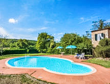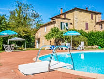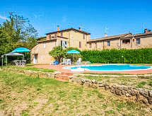 Enkel lantställe "Il Valacchio", med 2 våningar, tillbyggd på ena sidan. 5 km från centrumet av Sovicille, 14 km från centrumet av Siena, lugnt läge. För privat bruk: trädgård (inhägnad) med gräsmatta och träd, pool rund (6 x 12 m, 120 - 280 cm djup, tillgång säsongsbunden: 08.Jun. - 30.Sep.). Sittplats, trädgårdsmöbler, utegrill. I huset: centralvärme, uppvärmning endast tillgängligt från 01.11. till 15.04.. Parkering på tomten. Stormarknad 5 km, restaurang 3 km, järnvägsstation "Siena" 15 km. Närbelägna sevärdheter: San Gimignano, Pienza, Florence 80 km.Interior