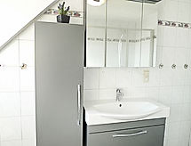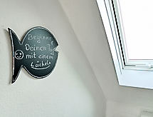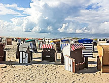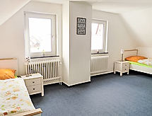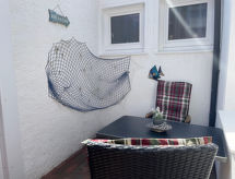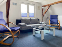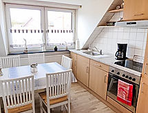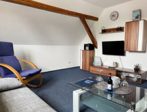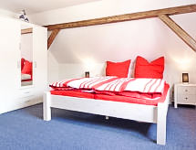 "Inselperle", 3-rums-lägenhet 100 m2, på övervåningen. Rymlig, delvis sluttande tak, vackert och smakfullt inredd: vardagsrum 20 m2 med sat-TV (flatscreen TV), radio och CD. 1 stort rum 30 m2 med 1 dubbelsäng (2 x 90 cm, längd 200 cm). 1 stort rum 30 m2 med 2 sängar (90 cm, längd 200 cm). Kök 8 m2 (ugn, 4 kokplattor - glaskeramikhäll, brödrost, vattenkokare, elektrisk kaffemaskin) med matbord. Badkar/dusch, sep. Toalett. 2 terrasser. Terrassmöbler. Utsikt på. Till förfogande: Internet (Trådlös LAN [WLAN] , gratis). Parkeringsplats (extra) i 200 m. Notera: rökfri lägenhet. Brandvarnare.- Kännetecken för boendet