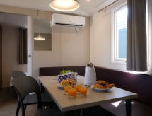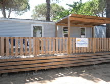 "Happy Standard Extra", 3-rums-mobile home 25 m2. Objekt passande för 4 vuxna + 1 barn. Praktiskt: vardags-/matrum med eluppvärmning och luftkonditionering. 1 rum med 1 fransk säng (140 cm, längd 190 cm). 1 rum med 1 x 2 våningssängar (70 cm, längd 190 cm), 1 utdragbar säng (1 pers. längd 175 cm). Öppet kök (4 kokplattor). Dusch/toalett. Luftkonditionering (extra). Terrass täckt. Terrassmöbler, elektrisk grill (flyttbar), vilstolar (2). Parkeringsplats (1 Bil), garage. Notera: rökfri lägenhet.- Utrustning
