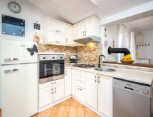 3-rums-hus 55 m2, sydvästläge. Vardags-/matrum med 1 bäddsoffa (140 cm, längd 200 cm), TV (flatscreen TV), luftkonditionering. Utgång till terrassen. 1 rum med 1 fransk säng (160 cm, längd 200 cm). 1 rum med 1 x 2 våningssängar (80 cm, längd 200 cm). Öppet kök (4 kokplattor, ugn, diskmaskin, frys, elektrisk kaffemaskin). Utgång till terrassen. Dusch/toalett. Luftkonditionering (extra). Terrass 12 m2, täckt. Terrassmöbler. Till förfogande: barnsäng, hårtork. Internet (Trådlös LAN [WLAN] , gratis).- Utrustning