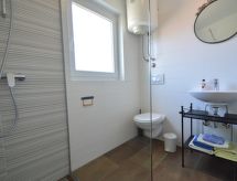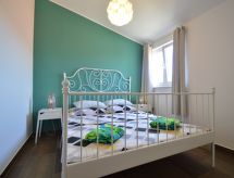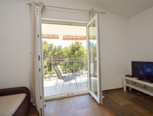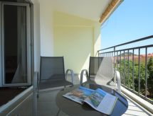 2-rums-lägenhet 40 m2 på 2. våningen, sydvästläge. Vardags-/matrum med 1 bäddsoffa för 2 personer (160 cm, längd 200 cm), sat-TV (flatscreen TV), luftkonditionering. Utgång till terrassen. 1 rum med 1 fransk säng (160 cm, längd 200 cm). Öppet kök (2 kokplattor - glaskeramikhäll, mikrovågsugn, frys, elektrisk kaffemaskin). Dusch/toalett. Luftkonditionering (extra). Terrass 8 m2, täckt. Terrassmöbler. Till förfogande: hårtork. Internet (Trådlös LAN [WLAN] , gratis).- Utrustning