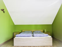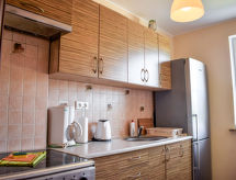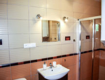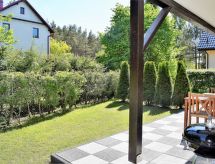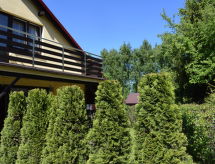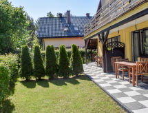 "Jantarowo 1A", 3-rums-ena hälften av ett parhus 75 m2 med 2 våningar. Delvis sluttande tak: salong med 1 bäddsoffa för 2 personer, öppen spis, matbord och sat-TV. Kök (4 kokplattor, ugn, frys). Dusch/toalett. Övre våning: 1 rum med 1 bäddsoffa och 1 dubbelsäng. 1 rum med 2 sängar (90 cm, längd 200 cm), 1 bäddsoffa. Eluppvärmning, vattenberedare (100 liter). Terrass 10 m2. Balkongmöbler, utegrill. Till förfogande: tvättmaskin.- Utrustning