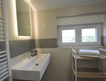 2-rums-lägenhet 32 m2 på 2. våningen, nordostläge. Vardags-/matrum med 1 bäddsoffa (160 cm, längd 200 cm), sat-TV (flatscreen TV), luftkonditionering. 1 rum med 1 dubbelsäng (2 x 80 cm, längd 200 cm). Öppet kök (diskmaskin, 2 kokplattor - glaskeramikhäll, vattenkokare, mikrovågsugn, elektrisk kaffemaskin). Dusch/toalett. Utsikt på havet. Till förfogande: tvättmaskin. Internet (Trådlös LAN [WLAN] , gratis). Max 1 litet husdjur/hund tillåtet.- Utrustning