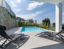 5-rums-villa 145 m2 med 2 våningar, sydvästläge. Rymlig och ljus, komfortabelt och luxuöst inredd: nedre våning: 1 rum med 1 fransk säng (160 cm, längd 200 cm), luftkonditionering, varmluftsuppvärmning och elektrisk fönsterlucka. Utgång till terrassen. 1 rum med 1 fransk säng (160 cm, längd 200 cm), dusch/toalett, luftkonditionering, varmluftsuppvärmning och elektrisk fönsterlucka. Utgång till terrassen. 1 rum med 1 x 2 våningssängar (90 cm, längd 190 cm), luftkonditionering, varmluftsuppvärmning och elektrisk fönsterlucka. Dusch/toalett. Övre våning: vardags-/matrum med matbord, sat-TV och digital-TV (flatscreen TV), luftkonditionering, varmluftsuppvärmning och elektrisk fönsterlucka. Utgång till terrassen, till swimmingpoolen. 1 rum med 1 fransk säng (150 cm, längd 190 cm), luftkonditionering, varmluftsuppvärmning och elektrisk fönsterlucka. Stort, öppet kök (ugn, diskmaskin, 3 Induktionshäll, brödrost, vattenkokare, mikrovågsugn, frys, elektrisk kaffemaskin, köksö). Badkar/toalett. Stor terrass, sydläge. Terrassmöbler. Härlig panoramautsikt på havet. Till förfogande: tvättmaskin, torktumlare, strykjärn, barnsäng, hårtork. Garage. Notera: TV bara ES, FR. Groups of young people and of 8 adults not allowed. Mountainous loc.: sometimes there is little water pressure. There is a water pump installed in the house. R00000001- Aktiviteter i närheten