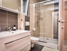 1-rums-lägenhet 36 m2, på bottenvåningen, sydostläge. Studio med 1 bäddsoffa (125 cm, längd 200 cm), 1 dubbelsäng (2 x 90 cm, längd 200 cm), sat-TV (flatscreen TV), luftkonditionering. Utgång till terrassen. Öppet kök (2 kokplattor - glaskeramikhäll, brödrost, vattenkokare, frys, elektrisk kaffemaskin). Dusch/toalett. Terrass 28 m2. Terrassmöbler. Till förfogande: tvättmaskin. Internet (Trådlös LAN [WLAN] , gratis). 1 husdjur/hund tillåtet.- Utrustning