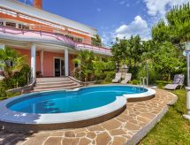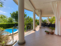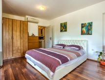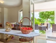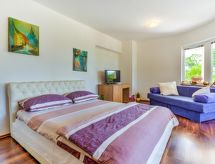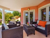 1-rums-lägenhet 36 m2, på bottenvåningen, sydvästläge. Studio med 1 bäddsoffa för 2 personer (150 cm, längd 190 cm), 1 dubbelsäng, sat-TV och luftkonditionering. Utgång till terrassen. Öppet kök (2 kokplattor - glaskeramikhäll, mikrovågsugn) med matbord. Dusch/toalett. Uppvärmning (extra), luftkonditionering (extra). Terrass 26 m2, täckt. Terrassmöbler. Utsikt på swimming-poolen och trädgården. Till förfogande: Internet (Trådlös LAN [WLAN] , gratis). Notera: privat entré, privat entré.- Utrustning