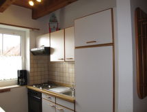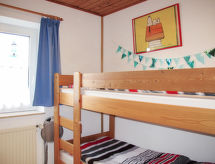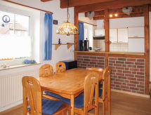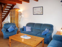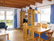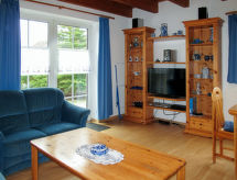 4-rums-ena hälften av ett parhus 72 m2 med 2 våningar, sydvästläge. Objekt passande för 4 vuxna + 2 barn. Mysigt inredd: vardags-/matrum med kabel-TV, stereoanläggning och DVD. Utgång till terrassen. Öppet kök (4 kokplattor, ugn, brödrost, vattenkokare, mikrovågsugn, elektrisk kaffemaskin). Dusch/toalett. Övre våning: 2 rum, till varje rum hör, 1 dubbelsäng. 1 barnrum med 1 x 2 våningssängar (70 cm, längd 160 cm). Sep. Toalett. Terrassmöbler, utegrill, vilstolar (2). Till förfogande: hög barnstol, barnsäng. Internet (Trådlös LAN [WLAN] , gratis). Notera: 2 husdjur/hundar tillåtna. Brandvarnare, brandsläckare.- Utrustning