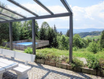13-rums-hus 310 m2 med 3 våningar. Rymlig, med mycket trä inrett: vardags-/matrum med köksblock, sat-TV, CD och stereoanläggning. Vardagsrum med sat-TV, CD och stereoanläggning. 1 rum med 1 säng och 1 dubbelsäng. 1 rum med 3 sängar. Kök (4 kokplattor, ugn, diskmaskin, 4 kokplattor - glaskeramikhäll, brödrost, vattenkokare, elektrisk kaffemaskin). Badkar/toalett. Övre våning: vardags-/matrum med köksblock, sat-TV och stereoanläggning. Vardagsrum med matbord, sat-TV och stereoanläggning. Utgång till balkongen. 1 rum med 1 säng och 1 dubbelsäng. 1 rum med 3 sängar. 1 dubbelrum. Utgång till balkongen. Kök (4 kokplattor, ugn, vattenkokare). 2 badkar/toaletter. 2:a våningen vardags-/matrum med snedtak med matbord, sat-TV och stereoanläggning. 1 rum med snedtak med 1 säng och 1 dubbelsäng. 1 rum med snedtak med 3 sängar. 1 rum med snedtak med 1 säng och 2 dubbelsängar. Utgång till balkongen. Kök (4 kokplattor, ugn, vattenkokare). 2 badkar/toaletter. Oljeuppvärmning. Balkong, terrass täckt, trädgårdssittplats. Terrassmöbler, balkongmöbler. Vacker panoramautsikt på landskapet. Till förfogande: tvättmaskin, torktumlare, hög barnstol, barnsäng. Internet (Trådlös LAN [WLAN] , gratis). Parkeringsplats (täckt, 2 Bilar). Notera: rökfritt hus. Max 3 husdjur/hundar tillåtna. Brandvarnare, brandsläckare.- Utrustning
