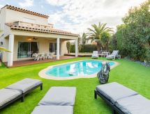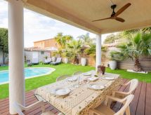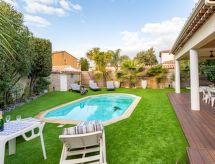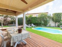 5-rums-hus 115 m2 med 2 våningar. Komfortabelt och vackert inrett: stort vardags-/matrum med TV (flatscreen TV), luftkonditionering. Utgång till terrassen, till swimmingpoolen. 1 rum med 1 fransk säng (140 cm, längd 190 cm). Stort, öppet kök (ugn, diskmaskin, 3 Induktionshäll, brödrost, vattenkokare, mikrovågsugn, frys, elektrisk kaffemaskin, Kapslar till kaffemaskin (Nespresso) extra). Utgång till terrassen. Dusch, sep. Toalett. Varmluftsuppvärmning. Övre våning: 1 rum med 1 fransk säng (140 cm, längd 190 cm), luftkonditionering. Utgång till balkongen. 1 rum med 1 fransk säng (160 cm, längd 200 cm), luftkonditionering. 1 rum med 2 sängar (90 cm, längd 190 cm), luftkonditionering. Badkar, dusch, sep. Toalett. Varmluftsuppvärmning. Terrass, sydläge. Terrassmöbler, utegrill. Till förfogande: tvättmaskin, torktumlare, strykjärn. Internet (Trådlös LAN [WLAN] , gratis). Parkeringsplats (3 Bilar). Notera: rökfri lägenhet. Brandvarnare. 83112 000645 X7- Kännetecken för boendet