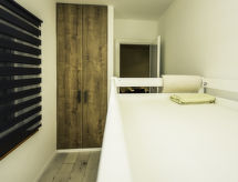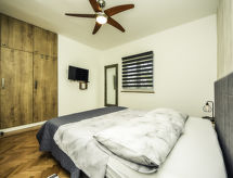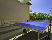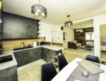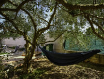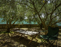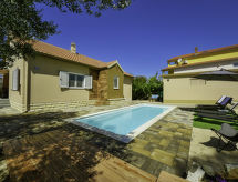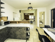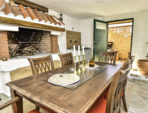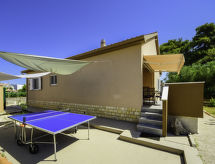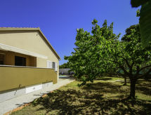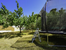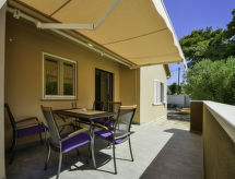 4-rums-hus 110 m2. Vardags-/matrum 30 m2 med 1 bäddsoffa för 2 personer (140 cm, längd 200 cm), sat-TV (flatscreen TV), luftkonditionering. Utgång till terrassen. 1 rum med 1 fransk säng (160 cm, längd 200 cm), sat-TV (flatscreen TV). 1 rum med 1 fransk säng (180 cm, längd 200 cm), sat-TV (flatscreen TV). 1 rum med 1 x 2 våningssängar (90 cm, längd 190 cm). Öppet kök (ugn, diskmaskin, 4 kokplattor - glaskeramikhäll, mikrovågsugn, frys, elektrisk kaffemaskin). 2 duschar/toaletter. Terrass 15 m2 täckt. Terrassmöbler, utegrill (flyttbar), vilstolar. Till förfogande: hårtork. Internet (Trådlös LAN [WLAN] , gratis).- Utrustning
