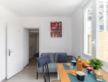 1-rums-studio 25 m2, på bottenvåningen, sydvästläge. Praktiskt inredd: litet vardagsrum med TV (flatscreen TV). Utgång till terrassen. 1 rum med 1 fransk säng (1 x 140 cm, längd 190 cm). Kokvrå (2 kokplattor, brödrost, vattenkokare, mikrovågsugn, elektrisk kaffemaskin). Dusch/toalett. Uppvärmning. Terrass 25 m2, sydläge. Balkongmöbler, utegrill. Utsikt på trädgården. Till förfogande: strykjärn, hårtork. Internet (Trådlös LAN [WLAN] , gratis). Parkeringsplats (1 Bil) vid huset. Notera: rökfri lägenhet. Brandvarnare. Annonsering av en privatperson enligt artikel 155, IV, CGI.- Utrustning