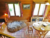 6-rums-chalet 140 m2 med 2 våningar. Enkelt och rustikt inrett: vardags-/matrum. Utgång till terrassen. Galleri med sat-TV och CD. Öppet kök (4 kokplattor, ugn, diskmaskin, vattenkokare, mikrovågsugn, frys, elektrisk kaffemaskin) med matbord. Sep. Toalett. Nedre våning: (utetrappa) vardags-/matrum med 1 bäddsoffa för 2 personer (140 cm, längd 190 cm). 1 rum med 1 fransk säng (140 cm, längd 190 cm). Utgång till trädgården. Kokvrå). Dusch/toalett. Övre våning: 1 rum med 1 fransk säng (140 cm, längd 190 cm). 1 rum med 2 sängar (90 cm, längd 190 cm). 1 rum med 2 sängar (90 cm, längd 190 cm), badkar. Utgång till balkongen. Galleri med 1 bäddsoffa för 2 personer (140 cm, längd 190 cm). Badkar, sep. Toalett. Oljeuppvärmning. Uppvärmning endast tillgängligt från 01.12. till 30.04. Balkong, sydvästläge. Vacker utsikt på bergen. Till förfogande: tvättmaskin. Internet (Trådlös LAN [WLAN] , extra). Notera: TV bara FR. Brandvarnare.- Aktiviteter i närheten
