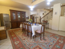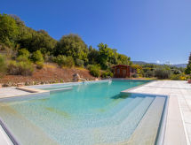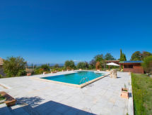 8-rums-villa 250 m2 med 2 våningar. Praktiskt och komfortabelt inredd: öppet stort vardagsrum med öppen spis, TV och flatscreen TV. Öppet stort matrum med TV och flatscreen TV. Utgång till trädgården. 2 dubbelrum, till varje rum hör, dusch/bidé/toalett, TV och flatscreen TV. 1 stort dubbelrum med TV och flatscreen TV. Stort kök (5 kokplattor, ugn, diskmaskin, frys, elektrisk kaffemaskin). Badkar/bidé/toalett, sep. Toalett, dubbelt handfat, bubbelbad. Övre våning: öppet vardagsrum med snedtak. Utgång till terrassen. 1 rum med snedtak med 2 sängar. 1 dubbelrum med snedtak med TV och flatscreen TV. Utgång till terrassen. Dusch/bidé/toalett. Luftkonditionering. Panoramautsikt på landskapet. Till förfogande: tvättmaskin, myggnät, hårtork. Internet (Trådlös LAN [WLAN] ). Notera: rökfritt hus. Vid bokning med ett mindre antal personer än det maximala är inte alla sovrum tillgängliga.- Kännetecken för boendet