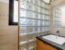 3-rums-lägenhet 53 m2 på 1. våningen. Vardags-/matrum med 1 bäddsoffa för 2 personer (1 x 140 cm, längd 190 cm), matbord och TV (flatscreen TV), luftkonditionering. Utgång till terrassen. 2 rum, till varje rum hör, 1 fransk säng (1 x 140 cm, längd 190 cm), luftkonditionering. Öppet kök (4 kokplattor, diskmaskin, brödrost, vattenkokare, frys, elektrisk kaffemaskin, Kapslar till kaffemaskin (SENSEO) extra, kombinerad mikrovågsugn). Dusch, sep. Toalett. Terrass. Terrassmöbler. Till förfogande: tvättmaskin, strykjärn. Internet (Trådlös LAN [WLAN] , extra). Notera: rökfri lägenhet. TV bara FR. Brandvarnare.- Kännetecken för boendet