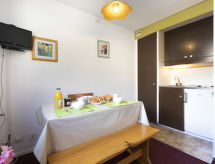 "Roche Blanche 17", 1-rums-lägenhet 17 m2 på 1. våningen, norrläge. Vardags-/matrum med 1 säng (90 cm, längd 190 cm), TV (flatscreen TV), kamin. Ingång med 1 x 2 våningssängar (80 cm, längd 190 cm). Kokvrå (2 kokplattor, elektrisk kaffemaskin, kombinerad mikrovågsugn). Badkar/toalett. Till förfogande: Internet (Trådlös LAN [WLAN] , extra). Notera: max 1 husdjur/hund tillåtet. Brandvarnare.- Kännetecken för boendet