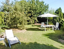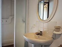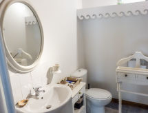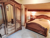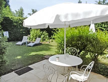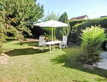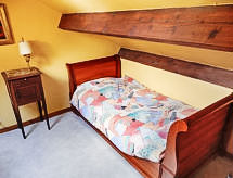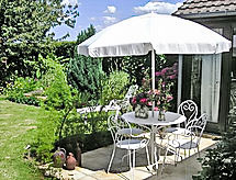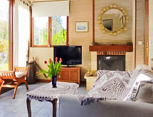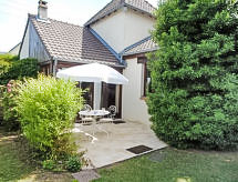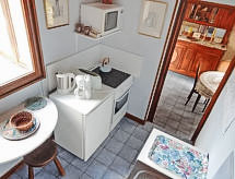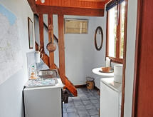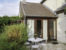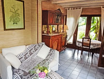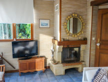 3-rums-hus 60 m2. Litet vardags-/matrum med braskamin, matbord och TV (flatscreen TV). Utgång till terrassen. Liten kokvrå (4 kokplattor, ugn, mikrovågsugn). Dusch/toalett. Övre våning: (brant trappa) genomgångsrum med snedtak med 1 säng (90 cm). 1 rum, låga dörrkarmar, 110 cm med 1 fransk säng (140 cm). Eluppvärmning. Terrass 12 m2, berså 10 m2. Terrassmöbler, utegrill, vilstolar (2). Till förfogande: Internet (Trådlös LAN [WLAN] , gratis). Parkeringsplats (2 Bilar). Notera: inte passande för små barn. TV bara FR, EN.- Utrustning