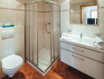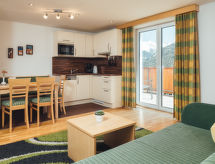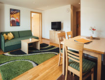 2-rums-lägenhet 44 m2 på 1. våningen. Komfortabelt och smakfullt inredd: 1 dubbelrum. Utgång till terrassen. Vardags-/sovrum med 1 bäddsoffa för 2 personer, matvrå och kabel-TV. Utgång till terrassen. Öppet kök (diskmaskin, 4 kokplattor - glaskeramikhäll, mikrovågsugn). 2 duschar/toaletter. Terrass 17 m2. Terrassmöbler. Härlig panoramautsikt på landskapet. Till förfogande: kassaskåp, hårtork. Internet (Trådlös LAN [WLAN] , gratis). Notera: rökfri lägenhet. Brandvarnare.- Kännetecken för boendet