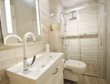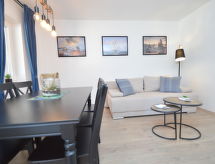 3-rums-hus 57 m2 med 2 våningar. Vardags-/matrum med 1 bäddsoffa för 2 personer (160 cm, längd 200 cm), TV (flatscreen TV). Utgång till terrassen. Öppet kök (ugn, diskmaskin, 4 gasflammor, vattenkokare, mikrovågsugn, elektrisk kaffemaskin). Dusch/toalett. Takvåning: (spiraltrappa) ingång med luftkonditionering. 1 rum med snedtak, takhöjd 110 - 247 cm med 1 fransk säng (160 cm, längd 200 cm). 1 rum med snedtak, takhöjd 110 - 247 cm med 2 sängar (90 cm, längd 200 cm). Terrass 27 m2, täckt. Terrassmöbler. Begränsad utsikt på havet. Till förfogande: strykjärn, hårtork. Internet (Trådlös LAN [WLAN] , gratis).- Utrustning