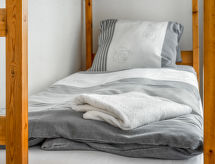 2-rums-lägenhet 55 m2 på 1. våningen. Vardags-/matrum 25 m2 med 1 bäddsoffa för 2 personer, sat-TV och stereoanläggning. 1 rum med 1 x 2 våningssängar, 1 dubbelsäng. Öppet kök (4 kokplattor, brödrost, vattenkokare, mikrovågsugn, elektrisk kaffemaskin). Dusch/toalett. Eluppvärmning. Till förfogande: Internet (Trådlös LAN [WLAN] , extra). Notera: rökfri lägenhet. Max 1 husdjur/hund tillåtet.- Utrustning