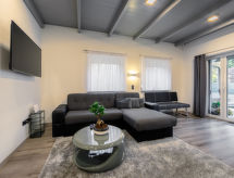 Modernt enfamiljshus "Lavendel", byggnadsår 2020. I orten 400 m från centrumet av Sosto, 5 km från centrumet av Siofok, soligt läge i ett bostadsområde, 500 m från sjön. För privat bruk: tomt 480 m2 (inhägnad) med gräsmatta och träd, gräsplan. I huset: Trådlös LAN [WLAN], tvättmaskin. Parkering på tomten. Affär 400 m, stormarknad 1.2 km, grässtrand 500 m. Cykelled 200 m. Objekt passande för 4 vuxna + 2 barn. Ägaren accepterar inga ungdomsgrupper.Interior