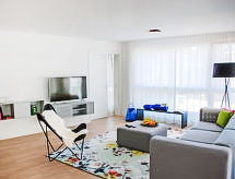 "LaVille B-3-2", 4-rums-lägenhet 99 m2 på 3. våningen. Objekt passande för 4 vuxna + 2 barn. Rymlig och ljus, smakfullt och stiligt inredd: öppet vardags-/matrum med sat-TV och flatscreen TV. 1 dubbelrum med 1 dubbelsäng (1 x 160 cm, längd 200 cm). 2 rum, till varje rum hör 2 sängar (90 cm, längd 200 cm). Öppet kök (ugn, diskmaskin, 4 Induktionshäll, frys, elektrisk kaffemaskin, Kapslar till kaffemaskin (Nespresso) extra) med matbord. Utgång till balkongen. Badkar/toalett, dusch/toalett. Golvvärme. Stor balkong 11 m2. Balkongmöbler, vilstolar (1). Utsikt på landskapet. Till förfogande: tvättmaskin, torktumlare, strykjärn, hög barnstol, barnsäng för barn under 2 år (extra), hårtork. Internet (Trådlös LAN [WLAN] , gratis). Parkeringsplats nr 56, höjd 210 cm, bredd 230 cm. Notera: lämpligt för barnfamiljer. Rökfri lägenhet.- Kännetecken för boendet