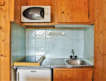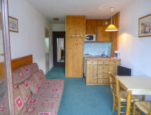 1-rums-studio 18 m2 på 2. våningen. Enkelt inredd: vardags-/matrum med 1 bäddsoffa för 2 personer (140 cm, längd 190 cm). Utgång till balkongen. Kokvrå (2 kokplattor, mikrovågsugn, elektrisk kaffemaskin). Badkar/toalett. Eluppvärmning. Liten balkong, sydvästläge. Vacker utsikt på bergen. Till förfogande: Internet (Trådlös LAN [WLAN] , extra). Notera: TV bara FR. Brandvarnare.- Kännetecken för boendet