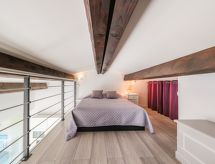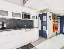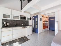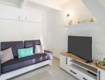 2-rums-lägenhet 35 m2 med 2 våningar på 2. våningen. Vardags-/matrum med TV (flatscreen TV), luftkonditionering. Öppen alkov med 1 x 2 våningssängar (90 cm, längd 190 cm). Öppet kök (diskmaskin, 2 kokplattor - glaskeramikhäll, mikrovågsugn). Badkar, sep. Toalett. Övre våning: öppet galleri med snedtak, takhöjd 96 - 122 cm med 1 fransk säng (140 cm, längd 200 cm). Stor balkong, sydostläge. Terrassmöbler. Vacker vidsträckt utsikt på havet och landskapet. Till förfogande: Internet (Trådlös LAN [WLAN] , extra). Notera: lämpligt för barnfamiljer lägenhet mot gatan. Kylskåp utan frysfack. Brandvarnare.- Kännetecken för boendet