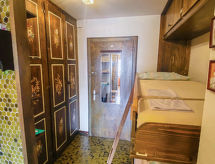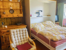 "Hameau A04", 1-rums-studio. Objekt passande för 2 vuxna + 3 barn. Enkelt och praktiskt inredd: vardags-/sovrum med 1 bäddsoffa, 2 väggsängar, 1 dubbelväggsäng och TV. Utgång till balkongen. Öppet kök (4 kokplattor, ugn, elektrisk kaffemaskin). Dusch/toalett. Balkong. Balkongmöbler. Till förfogande: Internet (Trådlös LAN [WLAN] , extra). Notera: rökfri lägenhet.- Kännetecken för boendet