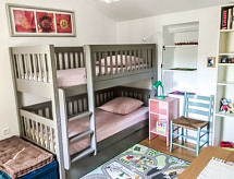 "Le Mazet", 4-rums-hus 86 m2 med 2 våningar. Komfortabelt inrett: vardags-/matrum med TV och internationella TV-kanaler (flatscreen TV), CD. 1 rum med 1 bäddsoffa för 2 personer (130 cm, längd 190 cm), sep. toalett och dusch. Utgång till terrassen. Kök (ugn, diskmaskin, 4 kokplattor - glaskeramikhäll, mikrovågsugn, elektrisk kaffemaskin). Övre våning: 1 rum med 1 x 2 våningssängar (90 cm, längd 190 cm). Sammanhängande rum med 1 fransk säng (140 cm, längd 190 cm). Dusch, sep. Toalett. Eluppvärmning. Stor terrass 30 m2, sydläge terrass 15 m2, västläge. Terrassmöbler, elektrisk grill (flyttbar). Till förfogande: tvättmaskin, strykjärn, barnsäng för barn under 2 år. Internet (Trådlös LAN [WLAN] , gratis). Parkeringsplats nr 294. Notera: brandvarnare. Huset i residenset stängs med en elektrisk grind. Tillgång till dubbelrummet sker genom ett rum med våningssängar. Tillgång till bottenvåningen sker utifrån. 83112000272FB- Utrustning