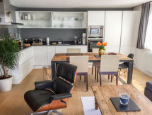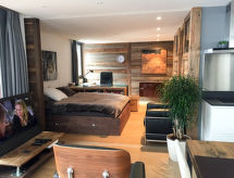 1-rums-loftvåning 52 m2 på 3. våningen. Rymlig, mycket komfortabelt: stort vardags-/matrum med TV och DVD. Utgång till balkongen. Sovalkov med 1 fransk säng (160 cm, längd 200 cm). Stort, öppet kök (ugn, diskmaskin, 3 Induktionshäll, brödrost, vattenkokare, mikrovågsugn, frys, elektrisk kaffemaskin, Kapslar till kaffemaskin (Nespresso) extra, raclettegrill, fondueset (ost )). Badkar/toalett. Eluppvärmning. Liten balkong, sydläge. Terrassmöbler. Mycket vacker utsikt på bergen. Till förfogande: tvättmaskin. Internet (Trådlös LAN [WLAN] , gratis). Garage nr 168 au 2ème sous-sol. Notera: brandvarnare.- Kännetecken för boendet