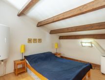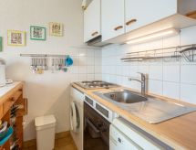 2-rums-lägenhet 40 m2 på 2. våningen, sydostläge. Komfortabelt inredd: vardagsrum med TV (flatscreen TV). 1 litet rum med 1 x 2 våningssängar (90 cm, längd 190 cm), 1 sovmöjliget (90 cm, längd 190 cm). Kokvrå (ugn, diskmaskin, brödrost, vattenkokare, frys, elektrisk kaffemaskin). Badkar, sep. Toalett. Ingen uppvärmningsmöjlighet. Övre våning: (brant trappa) öppen alkov med 1 fransk säng (140 cm, längd 190 cm). Vacker utsikt på havet. Till förfogande: tvättmaskin, strykjärn, hårtork. Internet (Trådlös LAN [WLAN] , extra). Parkeringsplats nr 33. Notera: rökfri lägenhet. TV bara FR. Brandvarnare.- Kännetecken för boendet