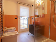 5-rums-hus 140 m2 med 2 våningar. Objekt passande för 4 vuxna + 1 barn. Rymlig, komfortabelt och smakfullt inrett: stort vardags-/matrum med TV och digital-TV (flatscreen TV), radio och CD. Utgång till trädgårdssittplatsen. Kokvrå (5 kokplattor, ugn, mikrovågsugn). Sep. Toalett. Övre våning: 1 rum med 2 sängar, 1 utdragbar säng och fläkt. 1 dubbelrum med fläkt. 2 duschar/bidéer/toaletter. Trädgårdssittplats, trädgård. Till förfogande: tvättmaskin. Internet (Trådlös LAN [WLAN] , gratis). Semesterbostaden är modern och ljus och består av tre nivåer. I den rymliga matsalen kan man ha fina måltider för familjen och uteplatsen är en perfekt plats att koppla av medan du sitter ute och njuter av trädgården.- Utrustning