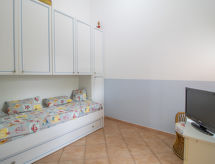 "Lena", 3-rums-ena hälften av ett parhus 45 m2. Praktiskt inredd: vardags-/matrum med 1 bäddsoffa, matbord, köksblock, sat-TV och luftkonditionering. Utgång till trädgården, till loggian. 1 dubbelrum med TV och flatscreen TV. 1 rum med 1 säng och 1 utdragbar säng. Kokvrå (ugn, 4 gasflammor, brödrost, vattenkokare, mikrovågsugn, frys). Dusch/toalett. Gasuppvärmning. Terrass täckt, trädgård. Terrassmöbler, utegrill, vilstolar. Till förfogande: tvättmaskin, hög barnstol, barnsäng. Internet (Trådlös LAN [WLAN] , gratis). Parkeringsplats (1 Bil). Notera: rökfritt hus. Privat entré, privat entré.- Kännetecken för boendet