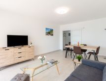 2-rums-lägenhet 57 m2 på 1. våningen, sydläge. Komfortabelt och modernt inredd: stort vardags-/matrum 25 m2 med 1 bäddsoffa (140 cm, längd 190 cm), TV (flatscreen TV), luftkonditionering. Utgång till terrassen. 1 rum med 1 fransk säng (1 x 160 cm, längd 200 cm). Kök (ugn, diskmaskin, 3 Induktionshäll, brödrost, vattenkokare, mikrovågsugn, elektrisk kaffemaskin). Dusch, sep. Toalett. Uppvärmning. Terrass 10 m2, sydläge. Terrassmöbler. Vacker utsikt på havet. Till förfogande: tvättmaskin, strykjärn, hårtork. Internet (Trådlös LAN [WLAN] , gratis). Notera: 1 husdjur/hund tillåtet. Brandvarnare. Annonsering av en privatperson enligt artikel 155, IV, CGI.- Kännetecken för boendet