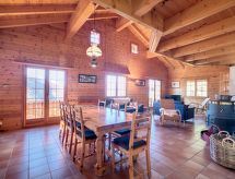 "Les 4 Saisons", 4-rums-chalet 180 m2 med 3 våningar, sydostläge. Rymlig, komfortabelt och med mycket trä inrett: stort vardags-/matrum med braskamin och kabel-TV. Utgång till balkongen, till terrassen, mot söder och mot väst. Stort, öppet kök (ugn, diskmaskin, 4 kokplattor - glaskeramikhäll, elektrisk kaffemaskin, raclettegrill, fondueset (chinoise, ost )). Badkar/toalett. Nedre våning: 1 rum med 1 dubbelsäng (2 x 90 cm, längd 190 cm). Utgång till trädgården. 1 rum med 1 fransk säng (140 cm, längd 190 cm). Utgång till trädgården. 1 rum med 1 x 2 våningssängar (90 cm, längd 190 cm). Utgång till trädgården. Dusch/toalett. Övre våning: öppet galleri med snedtak med 1 fransk säng (140 cm, längd 190 cm) (2 pers.). Stor balkong, sydläge och österläge, trädgård, gräsmatta. Terrassmöbler, utegrill. Panoramautsikt på bergen och skogen. Till förfogande: tvättmaskin, hårtork. Internet (Trådlös LAN [WLAN] , gratis). Garage (2 Bilar) i 150 m, höjd 200 cm. Notera: rökfritt hus.- Kännetecken för boendet