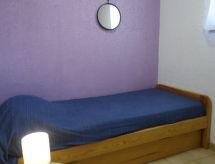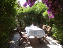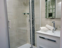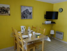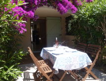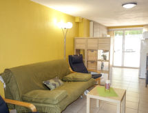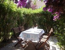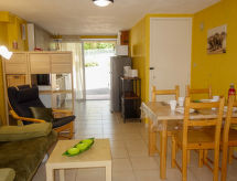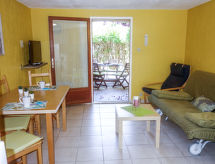 3-rums-lägenhet 47 m2 med 2 våningar, på bottenvåningen. Komfortabelt och vackert inredd: vardags-/matrum med 1 bäddsoffa (160 cm, längd 190 cm), TV. Utgång till terrassen. Öppet kök (ugn, 4 kokplattor - glaskeramikhäll, brödrost, vattenkokare, mikrovågsugn, frys, elektrisk kaffemaskin). Övre våning: 1 rum med 1 fransk säng (160 cm, längd 200 cm). Utgång till balkongen. 1 rum med 1 säng (80 cm, längd 190 cm). Dusch/toalett. Eluppvärmning. Balkong 5 m2, terrass 15 m2 täckt, västläge. Terrassmöbler. Till förfogande: tvättmaskin, strykjärn. Internet (Trådlös LAN [WLAN] , gratis). Parkeringsplats nr 12. Notera: rökfri lägenhet. Max 1 husdjur/hund tillåtet. TV bara FR. Brandvarnare.- Kännetecken för boendet