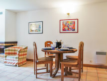 3-rums-lägenhet 50 m2 på 1. våningen. Vardags-/matrum med öppen spis och TV. Utgång till balkongen. 1 rum med 1 fransk säng. 1 rum med 1 x 2 våningssängar. Öppet kök (4 kokplattor, ugn, diskmaskin, vattenkokare, elektrisk kaffemaskin). Dusch/toalett. Eluppvärmning. Stor balkong, sydvästläge. Mycket vacker utsikt på bergen. Till förfogande: Internet (Trådlös LAN [WLAN] , gratis). Parkeringsplats nr 34 au sous sol, höjd 200 cm. Notera: TV bara FR. Brandvarnare.- Kännetecken för boendet