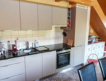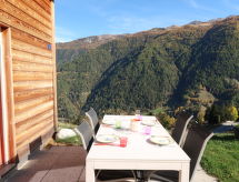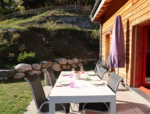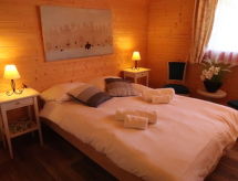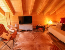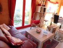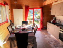 "Les Carlines", 3-rums-chalet 91 m2 med 2 våningar. Komfortabelt och med mycket trä inrett: vardags-/matrum. Utgång till terrassen. 1 rum med 1 fransk säng (140 cm, längd 200 cm). Öppet kök (ugn, diskmaskin, 4 kokplattor - glaskeramikhäll, mikrovågsugn, frys, elektrisk kaffemaskin, Kapslar till kaffemaskin (Nespresso) extra, raclettegrill, fondueset (chinoise, ost )). Dusch/toalett. Uppvärmning. Övre våning: salong med snedtak med kabel-TV och DVD. 1 rum med 2 sängar (90 cm, längd 190 cm). Terrass, sydläge. Terrassmöbler. Vacker utsikt på bergen. Till förfogande: tvättmaskin, torktumlare. Internet (Trådlös LAN [WLAN] ). Parkeringsplats (2 Bilar). Notera: rökfritt hus.- Utrustning