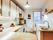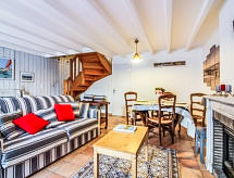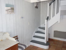 3-rums-hus 80 m2 med 2 våningar. Praktiskt och vackert inrett: vardags-/matrum med TV (flatscreen TV). Utgång till terrassen. Kök (ugn, diskmaskin, 3 Induktionshäll, mikrovågsugn, elektrisk kaffemaskin). Dusch/toalett. Övre våning: 1 rum med 2 sängar (90 cm, längd 190 cm). 1 rum med 1 dubbelsäng (2 x 90 cm, längd 190 cm). Dusch, sep. Toalett. Till förfogande: tvättmaskin. Internet (Trådlös LAN [WLAN] , gratis). Notera: rökfritt hus, parkeringsplats endast för små bilar. Brandvarnare.- Utrustning