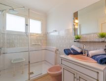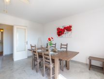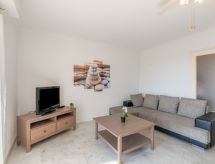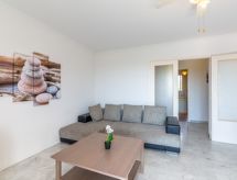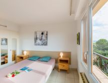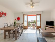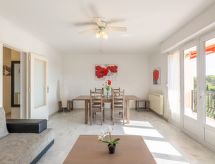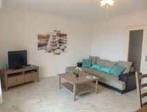 3-rums-lägenhet 70 m2 på 2. våningen. Komfortabelt och vackert inredd: vardags-/matrum med TV och elektrisk fönsterlucka. Utgång till balkongen. 1 rum med 2 sängar (80 cm, längd 190 cm), fläkt och elektrisk fönsterlucka. 1 rum med 1 fransk säng (1 x 160 cm, längd 200 cm), fläkt och elektrisk fönsterlucka. Kök (ugn, diskmaskin, 4 gasflammor, brödrost, vattenkokare, mikrovågsugn, frys, elektrisk kaffemaskin, Kapslar till kaffemaskin (senseo) extra). Utgång till loggian. Dusch, bidé, sep. Toalett. Eluppvärmning. Balkong. Balkongmöbler, vilstolar (1). Vidsträckt utsikt på havet. Till förfogande: tvättmaskin, strykjärn. Internet (Trådlös LAN [WLAN] , extra). Garage, höjd 195 cm, bredd 230 cm. Notera: lämpligt för barnfamiljer. 1 husdjur/hund tillåtet. TV bara FR. Brandvarnare.- Kännetecken för boendet