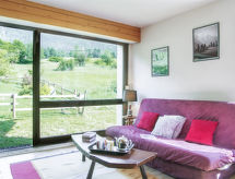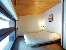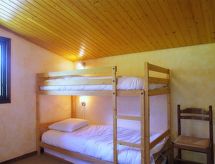 3-rums-radhus 60 m2 med 3 våningar. Vardags-/matrum med panoramafönster med TV. Utgång till trädgården. Öppet kök (diskmaskin, 2 kokplattor - glaskeramikhäll, vattenkokare, mikrovågsugn, elektrisk kaffemaskin) med serveringsöppning. Sep. Toalett. Nedre våning: ingång. Övre våning: 1 rum med snedtak med 1 fransk säng (140 cm, längd 190 cm). 1 rum med snedtak med 1 x 2 våningssängar (80 cm, längd 190 cm). Badkar, bidé. Eluppvärmning, vattenberedare. Trädgård, sydostläge och sydvästläge. Terrassmöbler. Mycket vacker utsikt på bergen. Till förfogande: tvättmaskin. Internet (Trådlös LAN [WLAN] , extra). Garage. Notera: rökfri lägenhet. TV bara FR. Brandvarnare.- Utrustning
