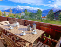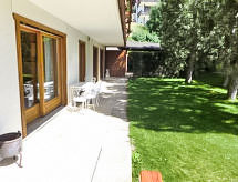 3-rums-lägenhet 80 m2, på bottenvåningen över marknivå. Rymlig, vackert inredd: vardags-/matrum med kabel-TV (flatscreen TV). Utgång till balkongen, mot söder. 1 rum med 1 dubbelsäng (160 cm, längd 200 cm). 1 barnrum med 1 x 2 våningssängar (90 cm, längd 190 cm). Kök (ugn, diskmaskin, 4 kokplattor - glaskeramikhäll, brödrost, vattenkokare, mikrovågsugn, elektrisk kaffemaskin, raclettegrill, fondueset (ost )). Utgång till trädgården, mot öster. Badkar, dusch/toalett. Stor terrass 25 m2, sydläge, gräsmatta. Terrassmöbler, vilstolar (2). Vacker utsikt på bergen och landskapet. Till förfogande: hårtork. Internet (Trådlös LAN [WLAN] , gratis). Garage, höjd 205 cm, bredd 200 cm. Notera: rökfri lägenhet.- Kännetecken för boendet