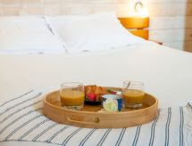2-rums-lägenhet i två våningar 46 m2 på 1. våningen. Vackert inredd: vardags-/matrum med TV och flatscreen TV. Utgång till balkongen. 1 rum med 2 sängar (80 cm). Öppet kök (2 kokplattor, miniugn, ugn, diskmaskin, mikrovågsugn, elektrisk kaffemaskin). Dusch, sep. Toalett. Eluppvärmning. Övre våning: (brant trappa) galleri med 1 fransk säng (140 cm). Liten balkong. Balkongmöbler. Till förfogande: tvättmaskin, strykjärn. Internet (Trådlös LAN [WLAN] , extra). Parkeringsplats nr 1 vid huset. Notera: brandvarnare, ingen hiss.- Utrustning