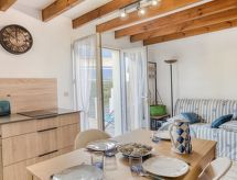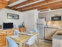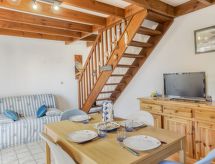"Les Ramendeuses", 3-rums-hus 31 m2 med 2 våningar. Komfortabelt inrett: vardags-/matrum med TV och flatscreen TV. Utgång till terrassen. Öppet kök (2 kokplattor, ugn, diskmaskin, brödrost, frys, elektrisk kaffemaskin, kombinerad mikrovågsugn). Övre våning: 1 rum med 1 fransk säng (1 x 160 cm, längd 190 cm). 1 rum med 2 sängar (80 cm, längd 190 cm). Dusch, sep. Toalett. Eluppvärmning. Stor terrass 25 m2.- Utrustning