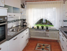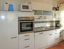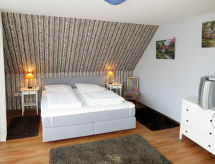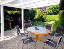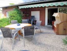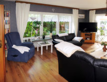 7-rums-hus 215 m2 med 2 våningar, på bottenvåningen. Ljus, mysigt inrett: vardagsrum med sat-TV (flatscreen TV), radio, CD och DVD. Utgång till terrassen. 1 rum med 1 säng (90 cm, längd 200 cm). 1 rum med 2 sängar (90 cm, längd 200 cm), handfat och sat-TV. Utgång till trädgården. Matrum. Kök (ugn, diskmaskin, 4 kokplattor - glaskeramikhäll, brödrost, vattenkokare, mikrovågsugn, frys, elektrisk kaffemaskin). Badkar/toalett, sep. Toalett. Övre våning: 1 rum med snedtak med 1 dubbelsäng (180 cm, längd 200 cm), sat-TV. Utgång till balkongen. 1 rum med snedtak med 1 dubbelsäng (180 cm, längd 200 cm), sat-TV. 1 rum med snedtak med 1 dubbelsäng (2 x 90 cm, längd 200 cm). Dusch/toalett. Terrass täckt. Terrassmöbler, balkongmöbler, utegrill (flyttbar), vilstolar (2), förråd. Till förfogande: tvättmaskin, torktumlare. Internet (Trådlös LAN [WLAN] , gratis). Notera: rökfri lägenhet. Max 2 husdjur/hundar tillåtna. Brandvarnare.- Kännetecken för boendet
