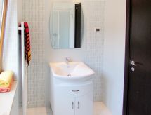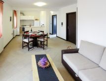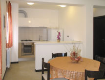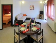 2-rums-lägenhet 47 m2 på 1. våningen. Vardags-/matrum med 1 bäddsoffa för 2 personer och sat-TV (flatscreen TV), luftkonditionering. Utgång till balkongen. 1 rum med 1 fransk säng (160 cm). Öppet kök (1 kokplatta, ugn, 3 gasflammor, brödrost, vattenkokare, frys, elektrisk kaffemaskin). Dusch/toalett. Varmluftsuppvärmning. Balkong. Balkongmöbler, vilstolar (2). Till förfogande: tvättmaskin. Internet (Trådlös LAN [WLAN] , gratis). Parkeringsplats (1 Bil). Notera: rökfri lägenhet.- Utrustning