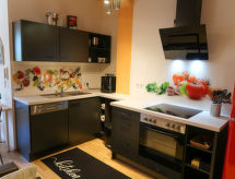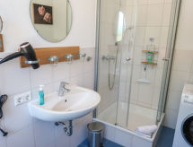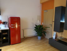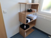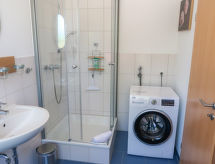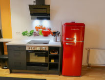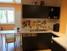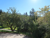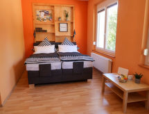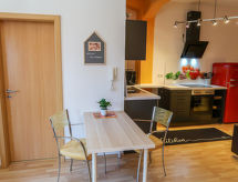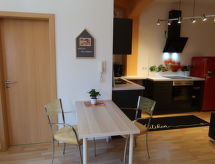 "Loft-Riedi", 1-rums-studio 46 m2, på bottenvåningen. Ljus, mycket modernt och smakfullt inredd: vardags-/sovrum med 1 dubbelsäng (2 x 90 cm, längd 200 cm), sat-TV. Öppet kök (ugn, diskmaskin, 4 kokplattor - glaskeramikhäll, brödrost, vattenkokare). Dusch/toalett. Uppvärmning. Parkettgolv. Till förfogande: tvättmaskin, bastu (extra), hårtork. Internet (Trådlös LAN [WLAN] , gratis). Notera: rökfri lägenhet. Brandvarnare, brandsläckare.- Utrustning
